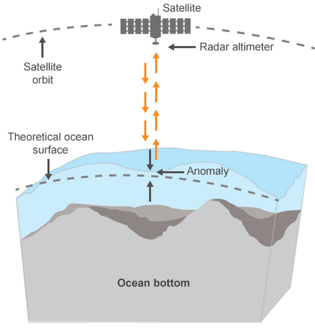 Seafloor mapping (or seabed mapping), also called seafloor imaging (or seabed imaging), is the measurement, mapping, and imaging of water depth of the ocean (seabed topography) or another given body of water. The bumps, too small to be seen, can be measured by a radar altimeter aboard a satellite. So, instead of depending on sonar, researchers looked to something else: Gravity.